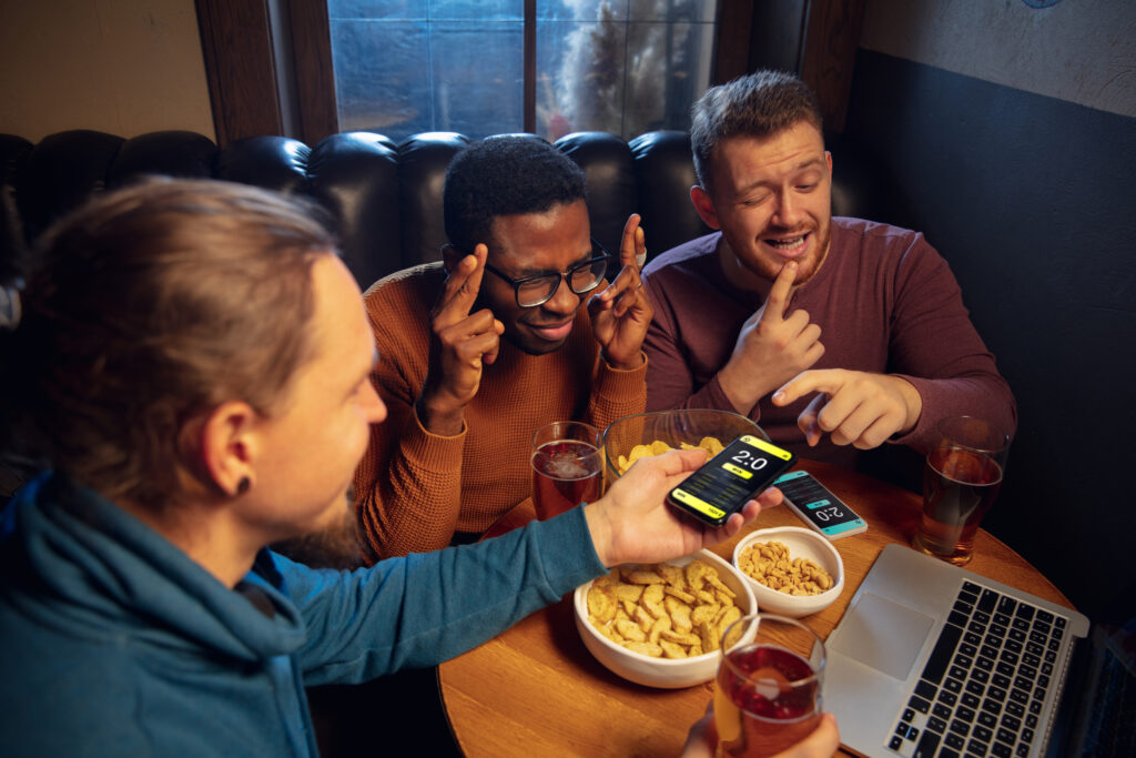 Device screen with mobile app for betting and score. Device with match results on screen, excited fans on background during match. Gambling, betting, sport, finance, modern technologies concept.